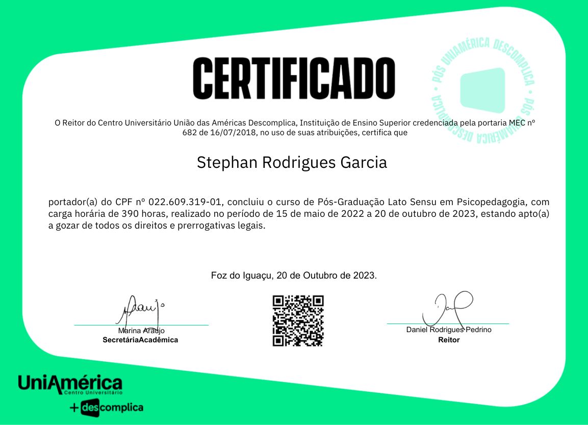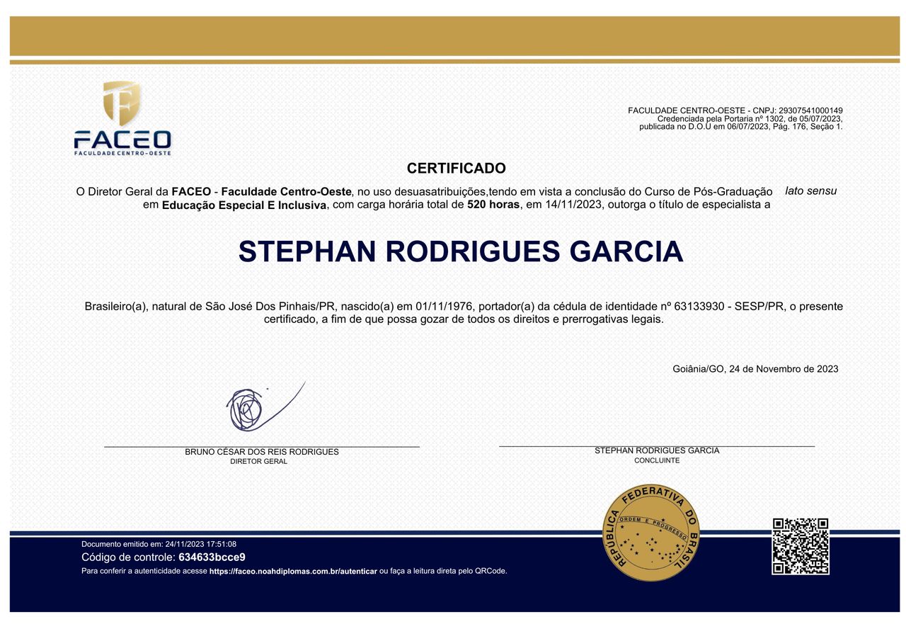 Sou Stephan Garcia, Neuropsicopedagogo, com atuação clínica, institucional e educacional, especializado no acompanhamento de crianças e adolescentes com dificuldades de aprendizagem, transtornos do neurodesenvolvimento e necessidades educacionais específicas.